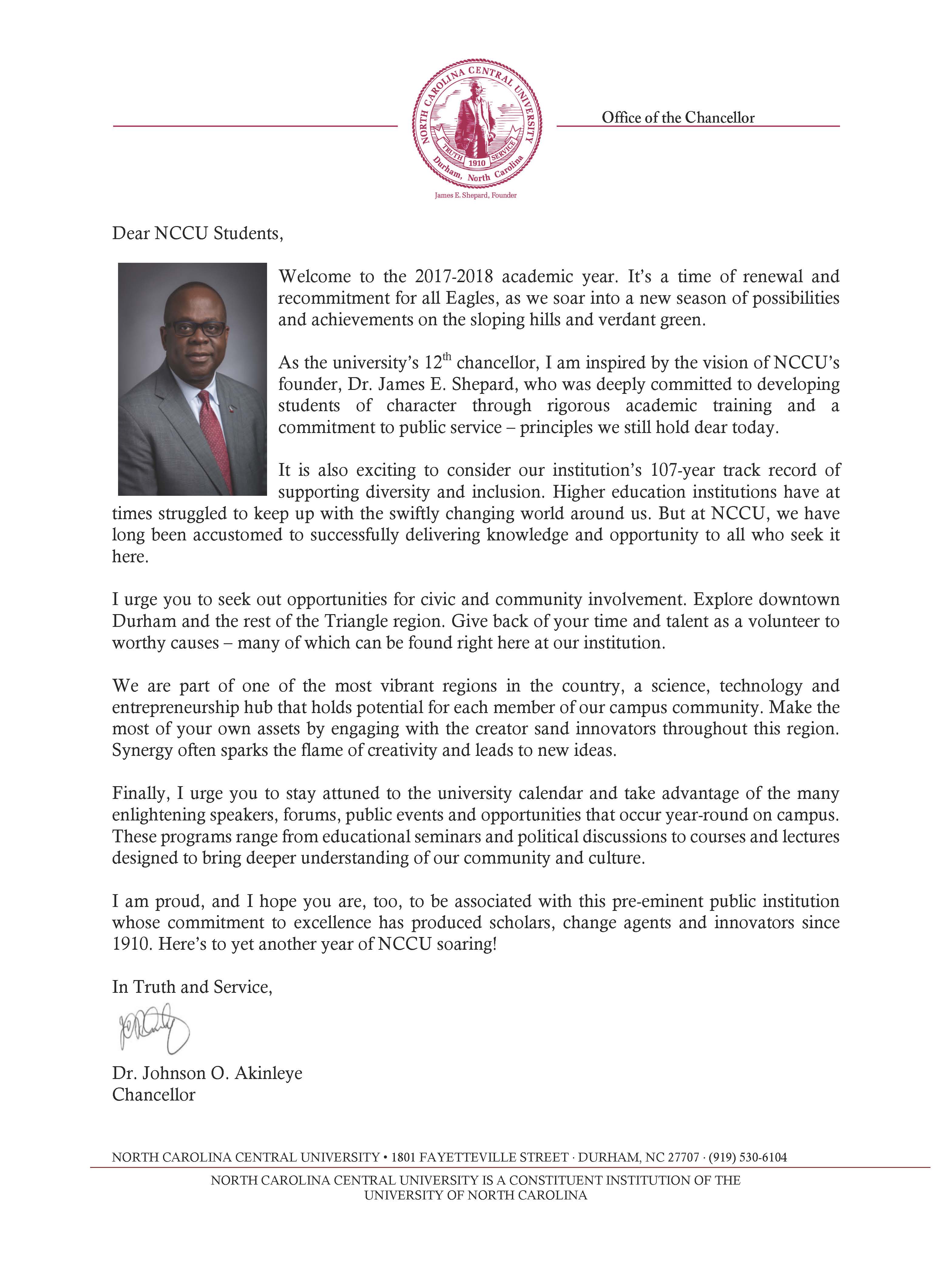 North Carolina Central University is committed to equal educational opportunity and does not discriminate against applicants, students or employees based on race, color, national origin, religion, sex, age or handicap. Moreover, NCCU is open to people of all races and actively seeks to promote racial integration by recruiting and enrolling a culturally and racially diverse student population. This commitment is in keeping with Title IX of the Educational Amendments of 1972 and Section 504, Rehabilitation Act of 1973. The Bulletin of North Carolina Central University (USPS 074-800) is issued every two years by North Carolina Central University, Durham, NC 27701-1912. Periodical Postage Paid at Durham, NC, 27701. Postmaster should send address change to the Bulletin of NCCU, Office of Admissions, McDougald House, Lawson Street, Durham, NC 27701-1912.